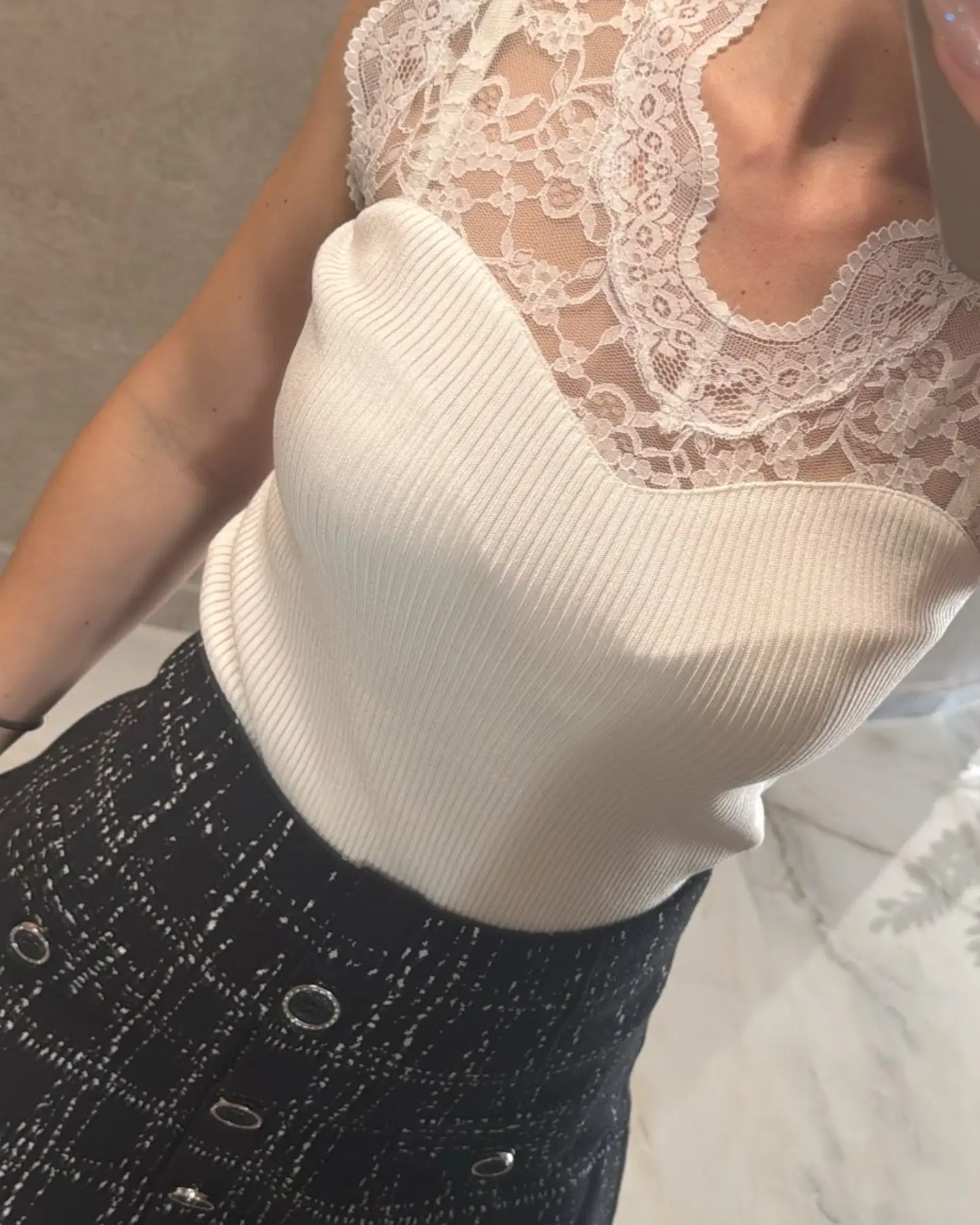 Στυλάτη γυναικεία ριπ μπλούζα αμάνικη με δαντέλα στο πάνω μέρος. Διαθέσιμη σε λευκό και μαύρο.