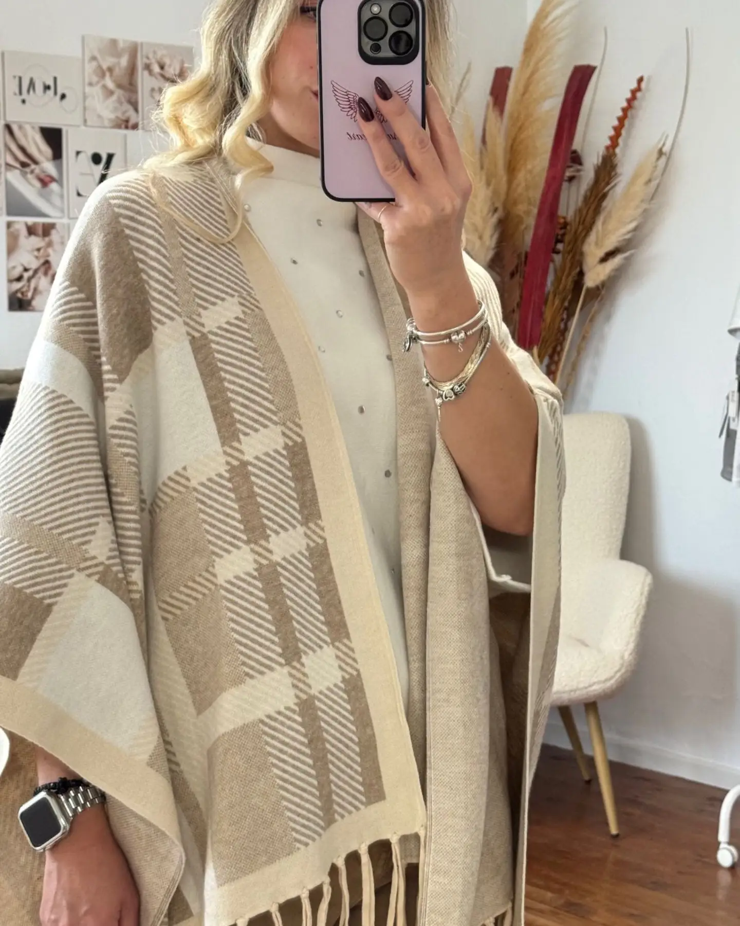 Καρό κάπα σε γήινες αποχρώσεις με κρόσσια, που συνδυάζει κομψότητα και ζεστασιά.