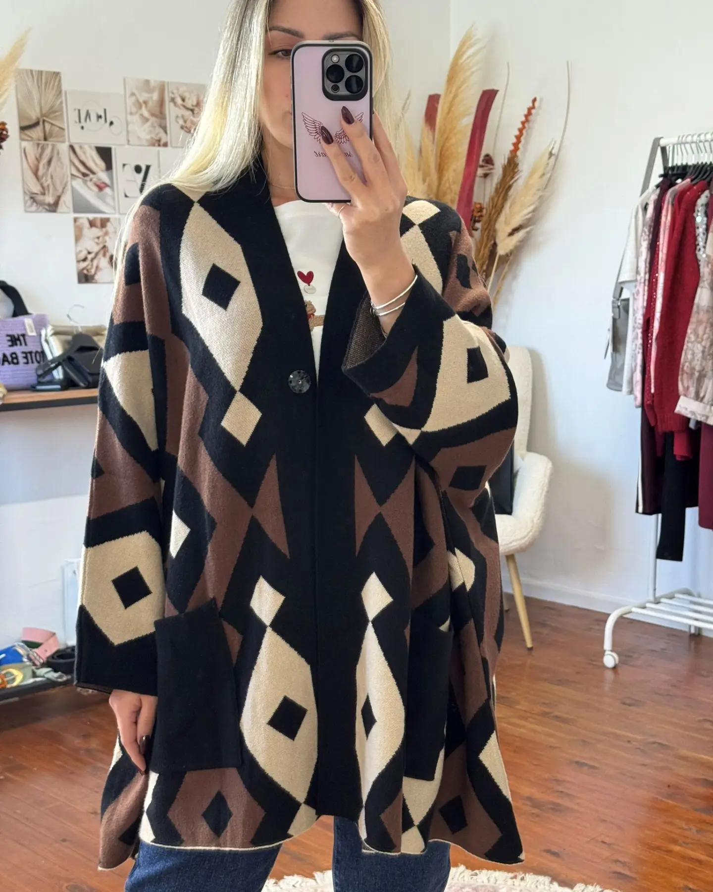 Πλεκτή ζακέτα “Maya” σε ζεστούς γήινους τόνους, με γεωμετρικό σχέδιο και κουμπί μπροστά.