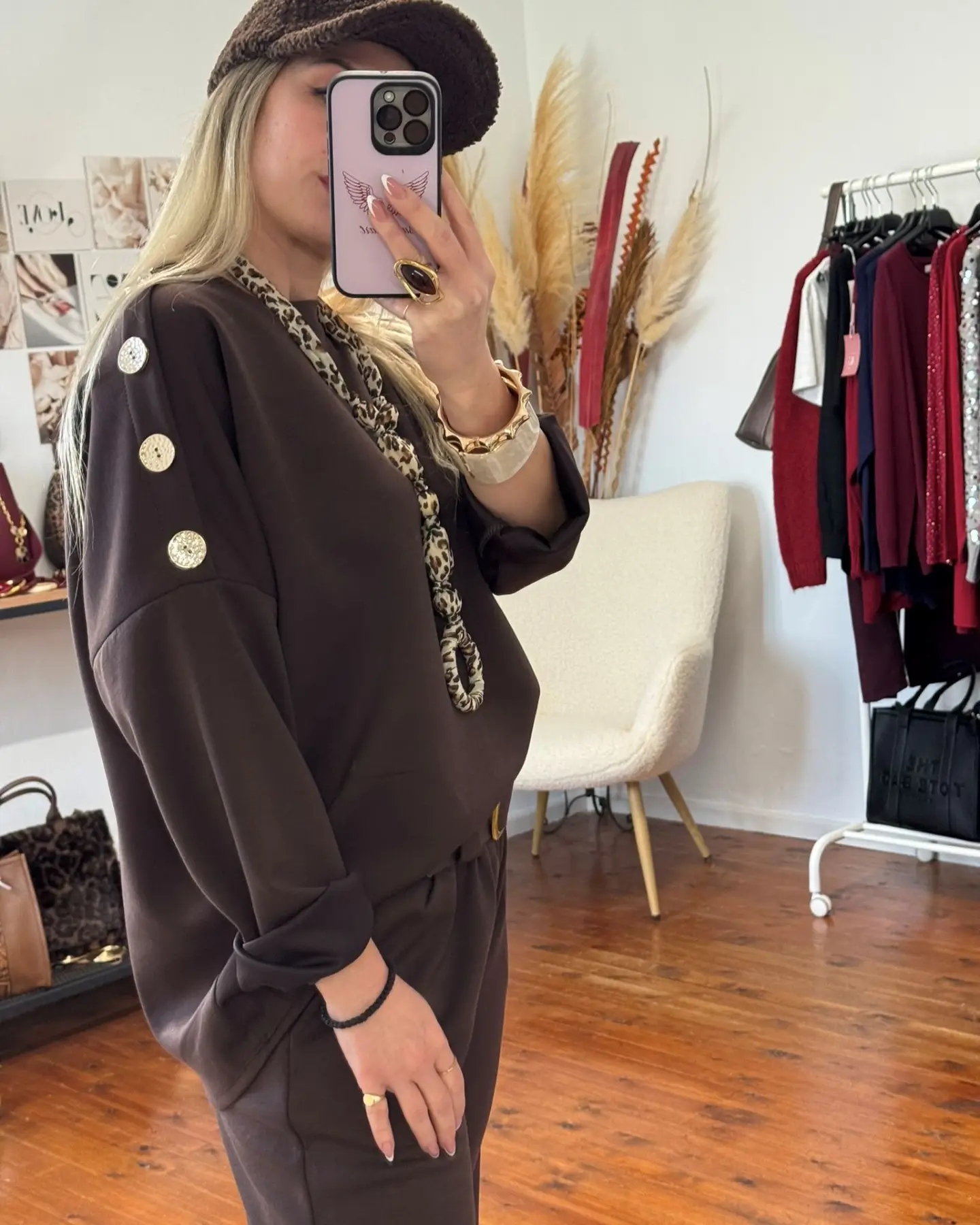 Σετ σε καφέ χρώμα με κουμπιά στους ώμους, σχεδιασμένο για άνεση και στυλ. Η χαλαρή γραμμή του το κάνει ιδανικό για καθημερινή χρήση, ενώ οι λεπτομέρειες στους ώμους προσθέτουν μια ιδιαίτερη πινελιά.