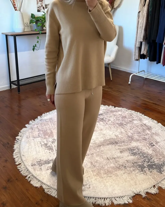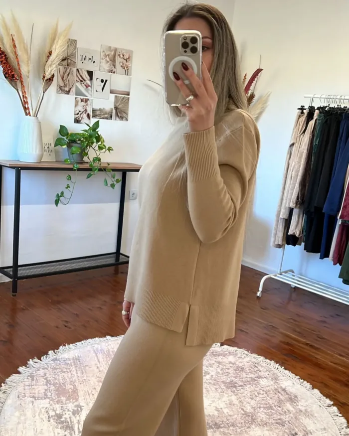 Σετ πλεκτό σε μπεζ χρώμα.